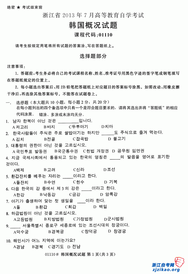浙江省2013年7月自考01110韩国概况试题
