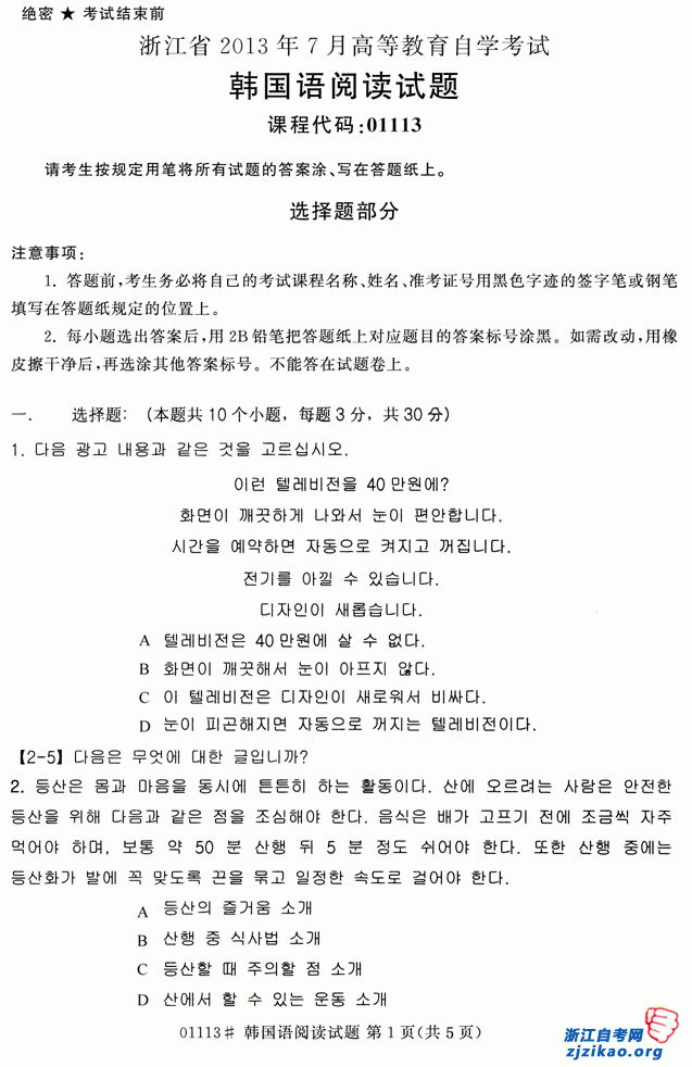 浙江省2013年7月高等教育自学考试韩国语阅读试题课程代码:01113