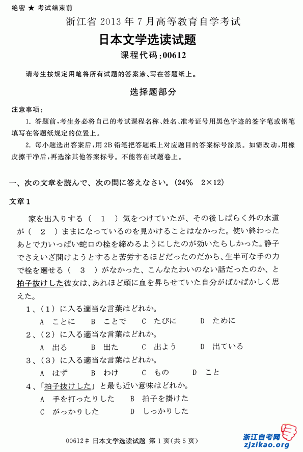 浙江省2013年7月高等教育自学考试日本文学选读试题课程代码:00612
