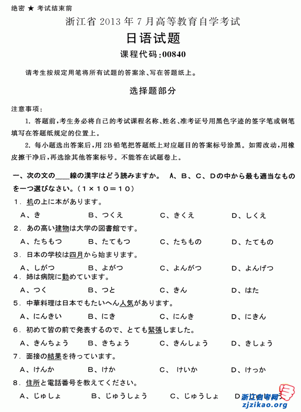浙江省2013年7月高等教育自学考试日语试题课程代码:00840