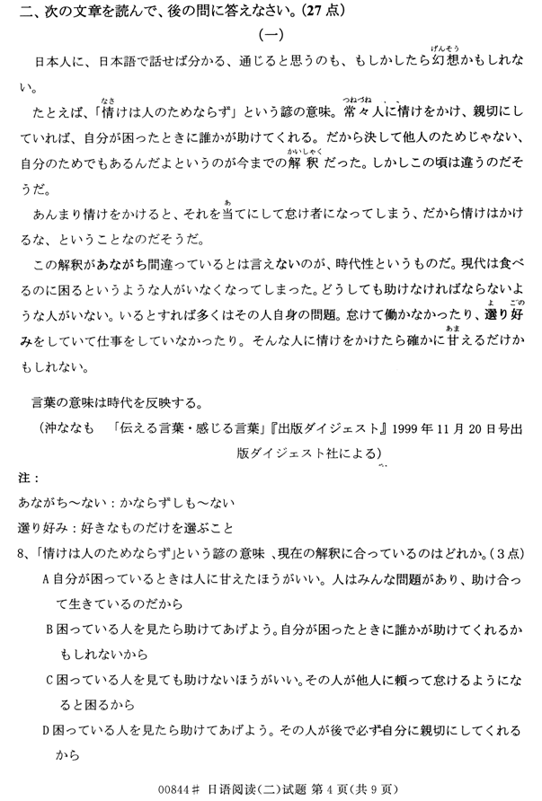 浙江省2014年4月自学考试00844日语阅读(二)试题