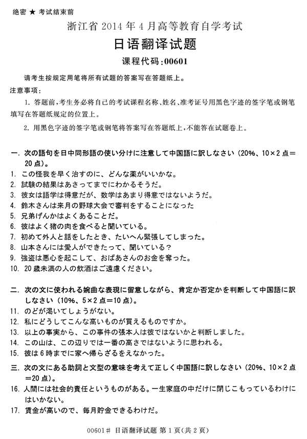 浙江省2014年4月自学考试00601日语翻译试题