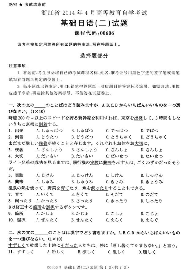 浙江省2014年4月自学考试00606基础日语(二)试题