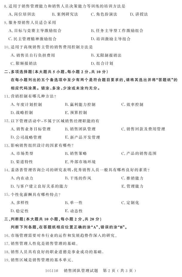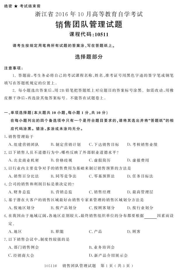 浙江省2016年10月自考10511《销售团队管理》试题.pdf