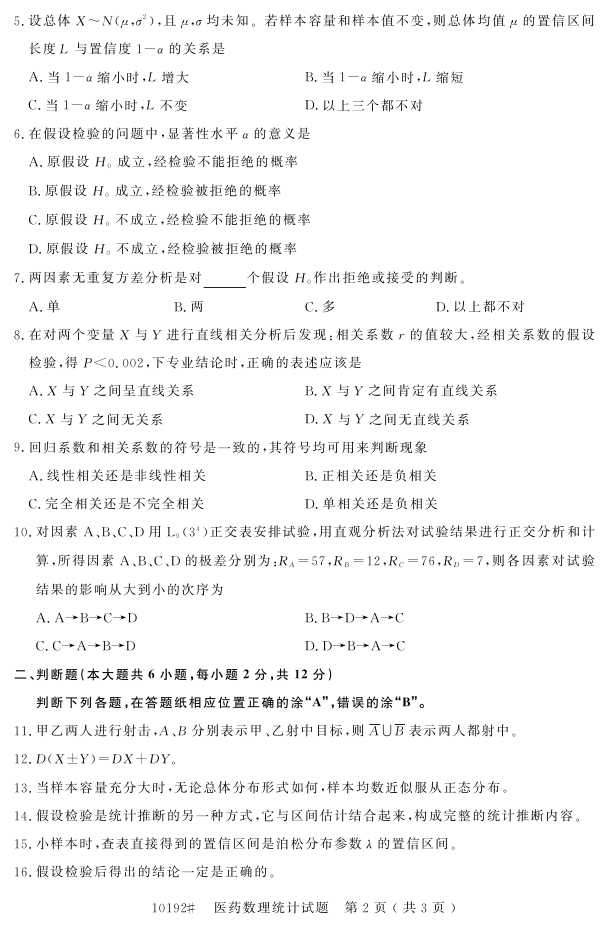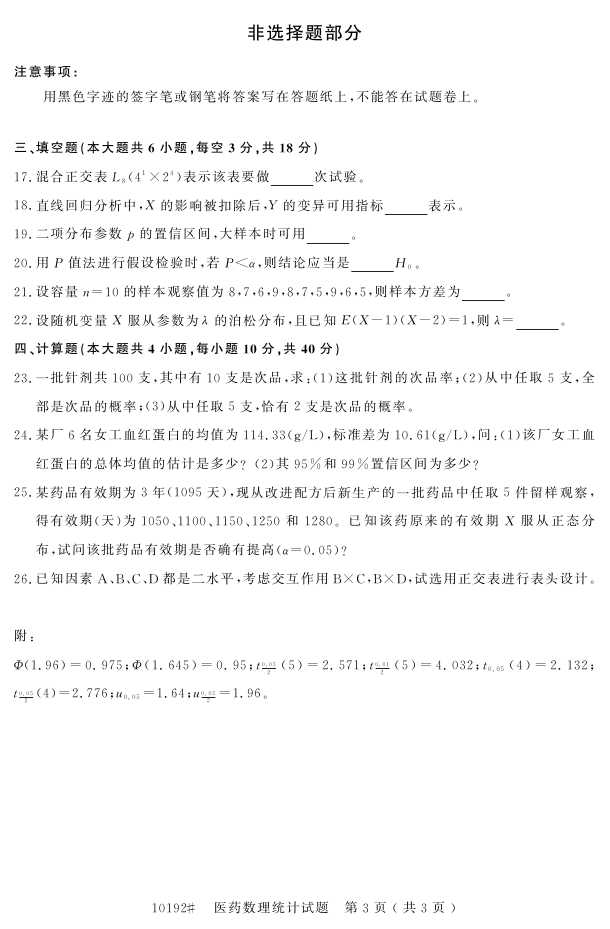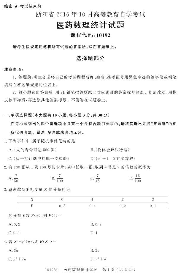 浙江省2016年10月自考10192《医药数理统计》试题.pdf