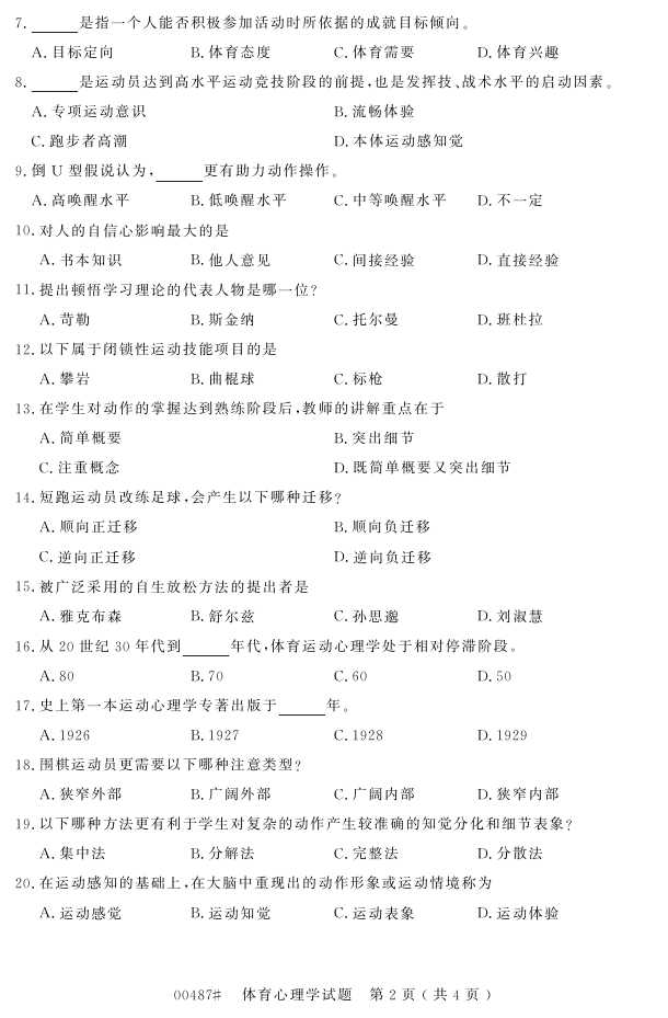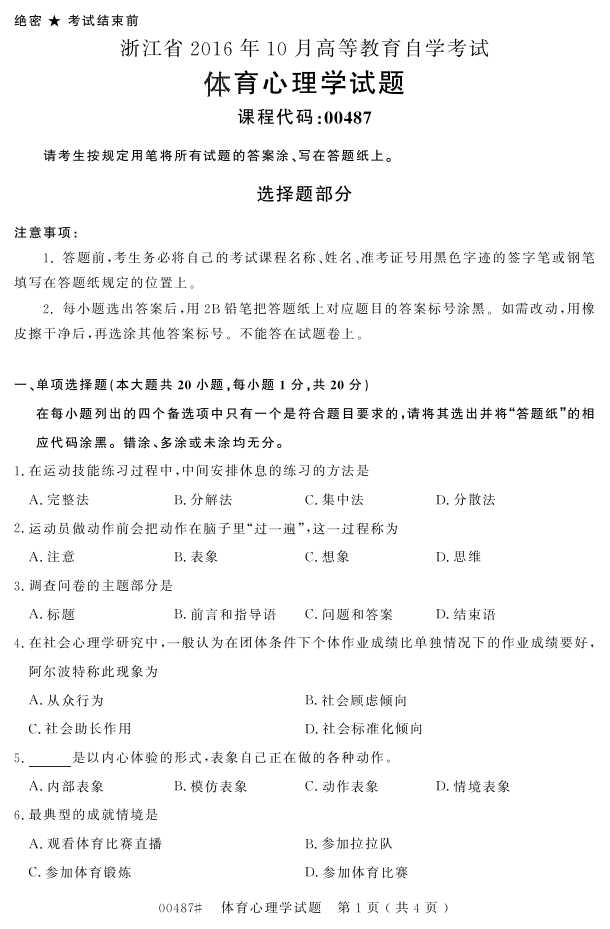 浙江省2016年10月自考00487《体育心理学》试题.pdf
