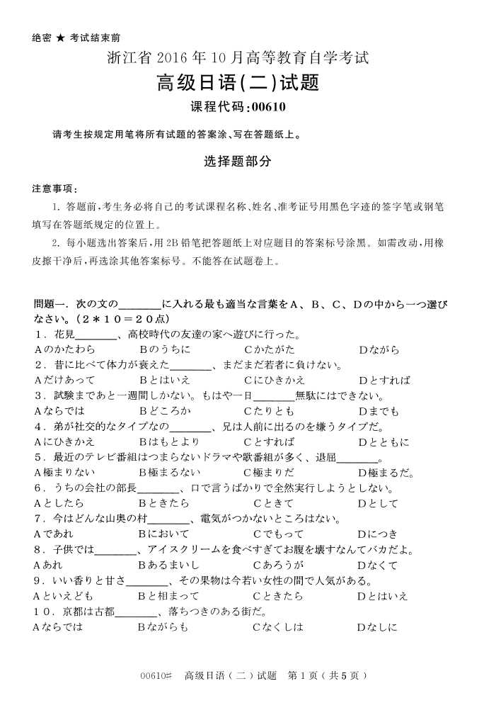 浙江省2016年10月自考00610《高级日语(二)》试题