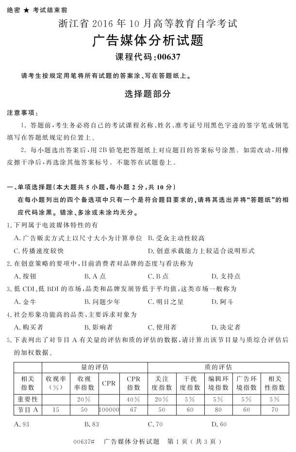 浙江省2016年10月自考00637《广告媒体分析》试题.pdf