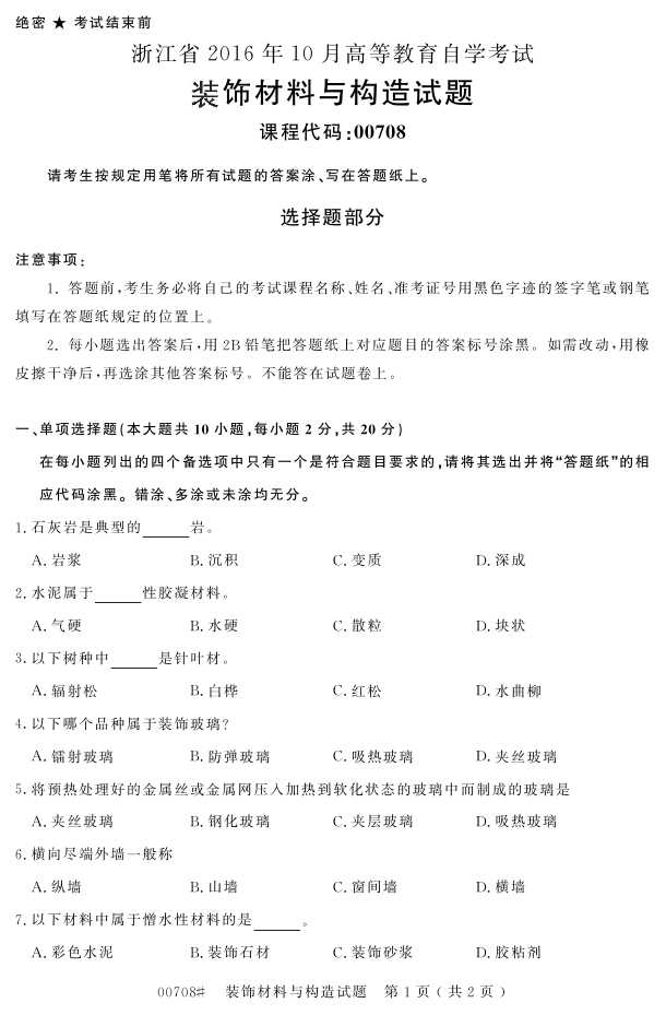浙江省2016年10月自考00708《装饰材料与构造》试题.pdf