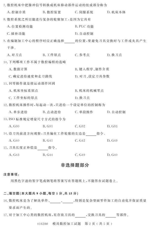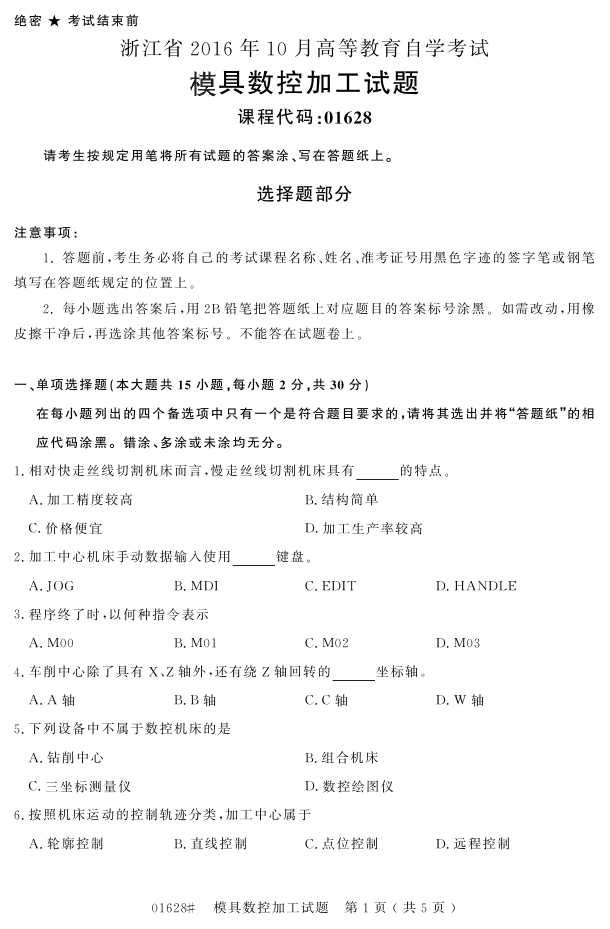 浙江省2016年10月自考01628《模具数控加工》试题.pdf