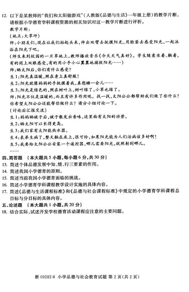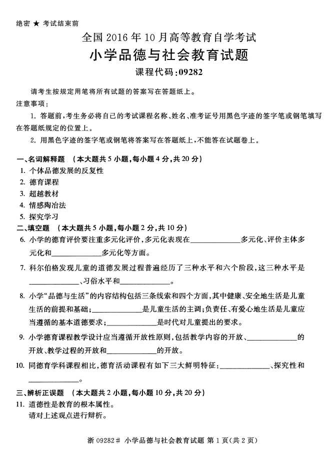 全国2016年10月自考09282《小学品德与社会教育》试题.pdf