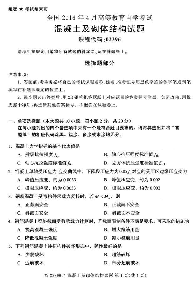 全国2016年4月02396《混凝土及砌体结构》试题.pdf