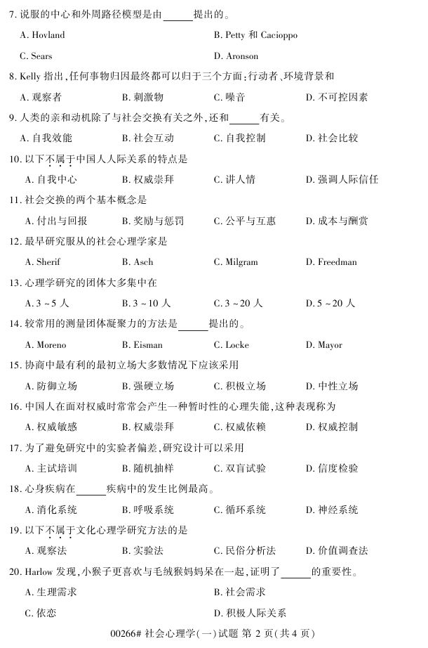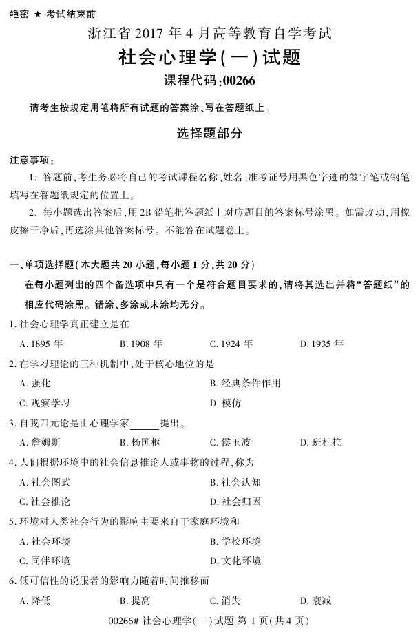 浙江省2017年4月自考00266《社会心理学(一)》试题.pdf