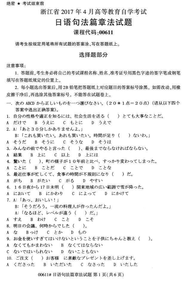 浙江省2017年4月自考00611《日语句法篇章法》试题.pdf