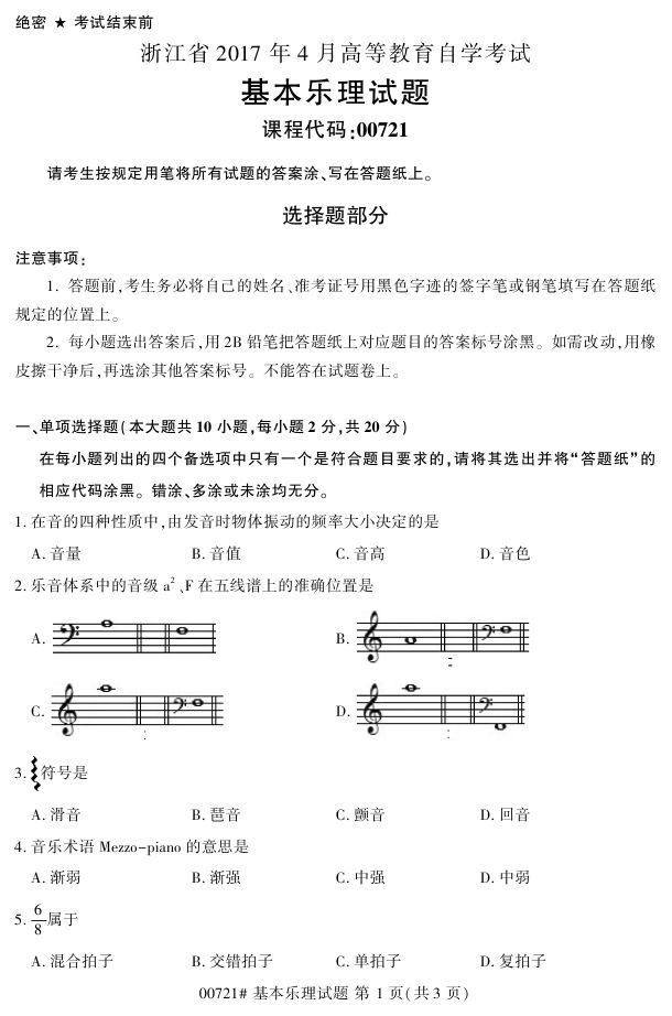 浙江省2017年4月自考00721《基本乐理》试题.pdf
