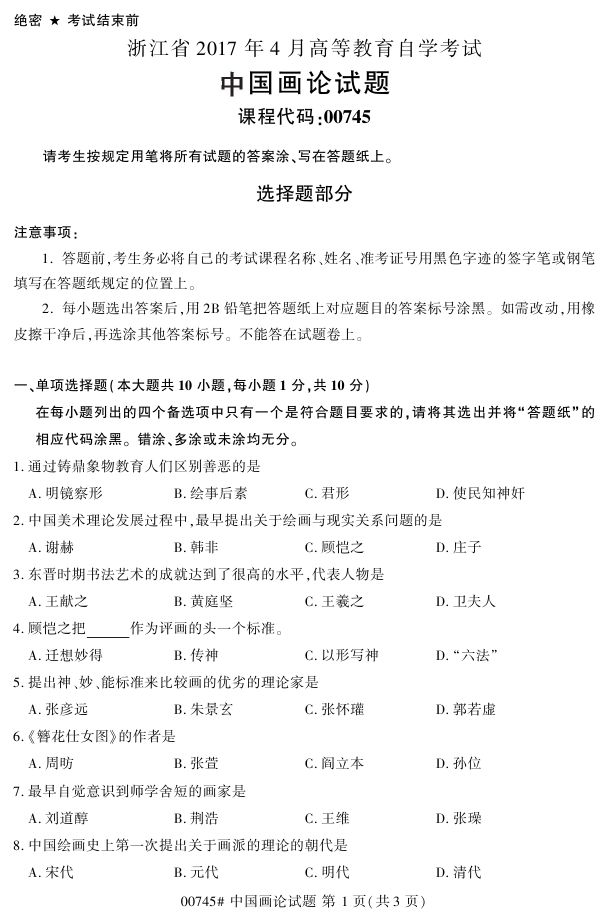 浙江省2017年4月自考00745《中国画论》试题.pdf