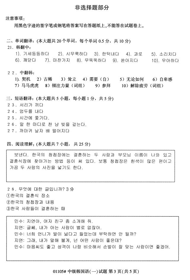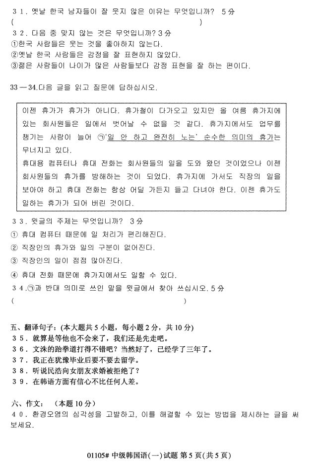 浙江省2017年4月自考01105《中级韩国语(一)》试题