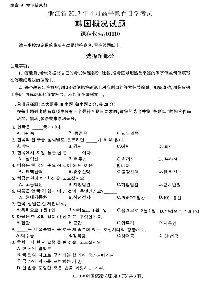 浙江省2017年4月自考01110《韩国概况》试题.pdf