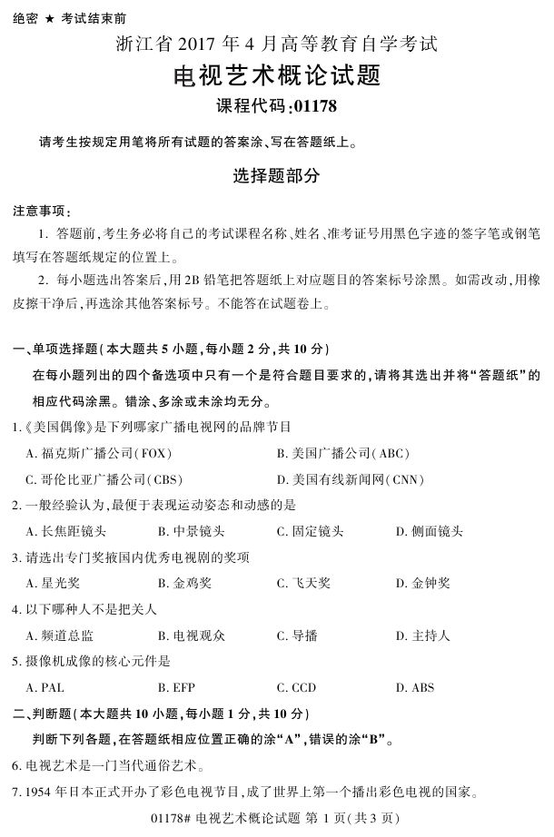 浙江省2017年4月自考01178《电视艺术概论》试题.pdf