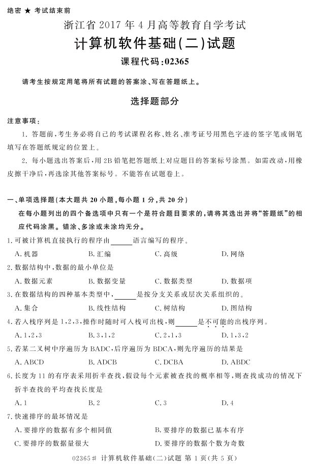 浙江省2017年4月自考02365《计算机软件基础(二)》试题