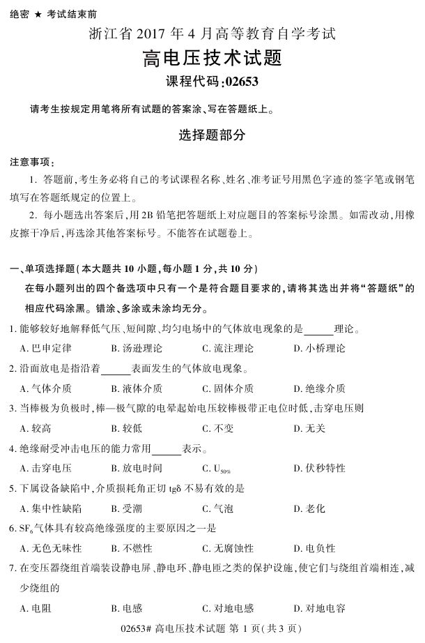 浙江省2017年4月自考02653《高电压技术》试题.pdf