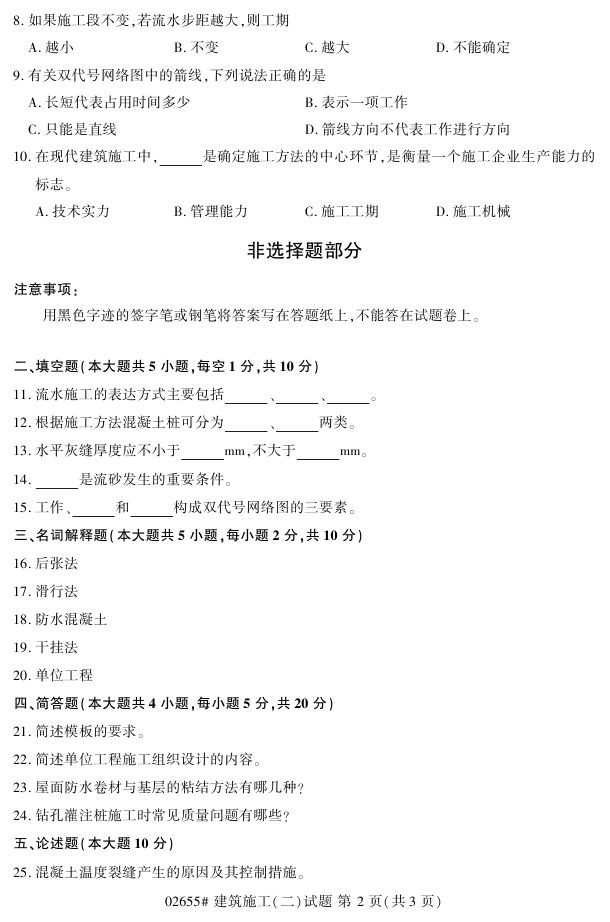 浙江省2017年4月自考02655《建筑施工(二)》试题