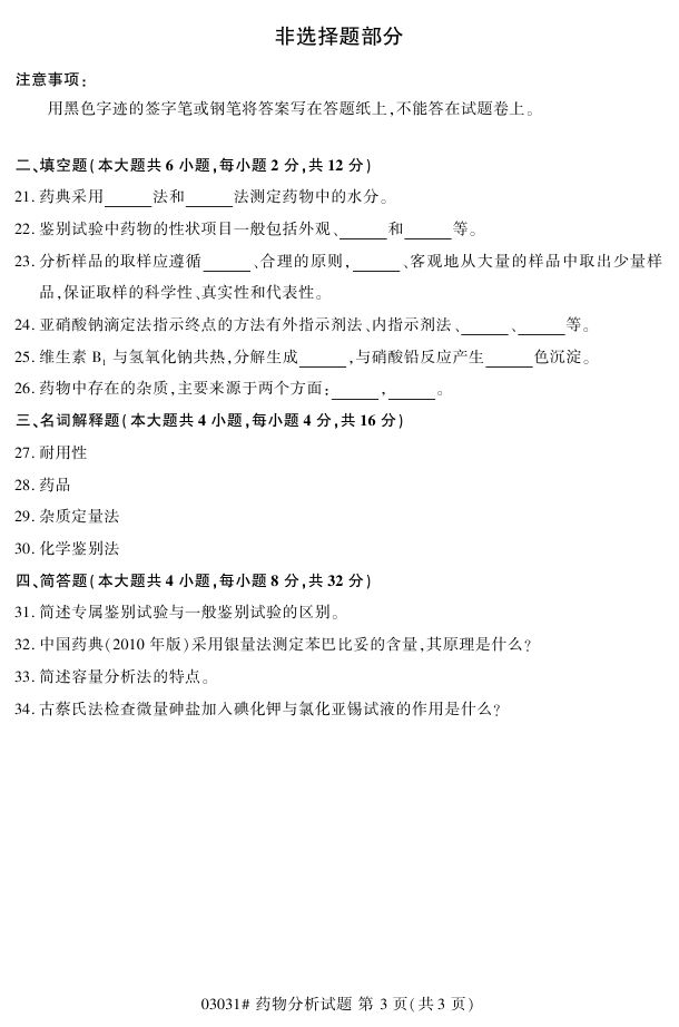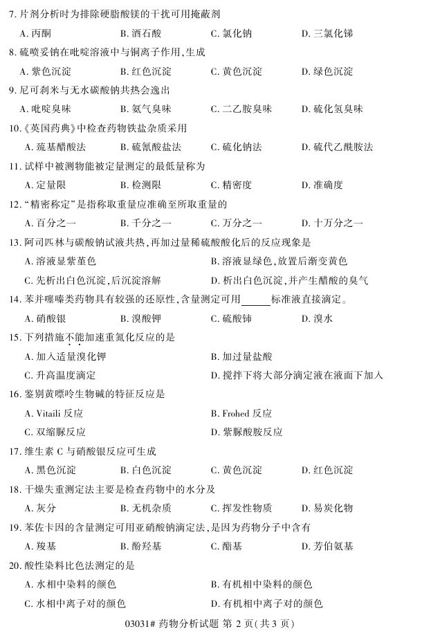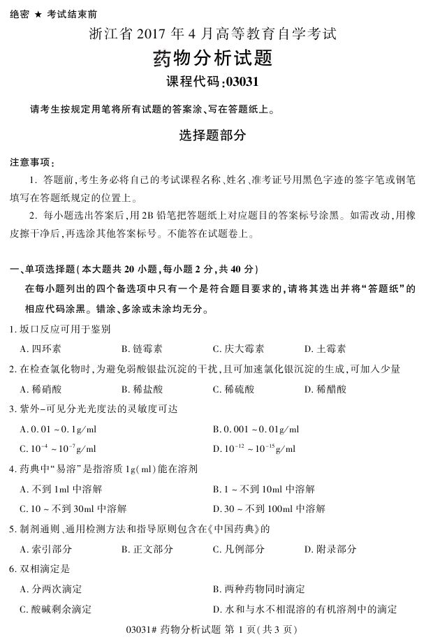 浙江省2017年4月自考03031《药物分析》试题.pdf