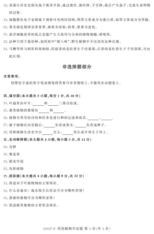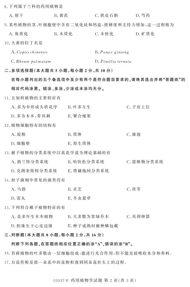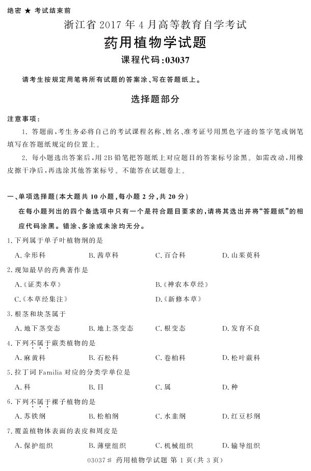 浙江省2017年4月自考03037《药用植物学》试题.pdf