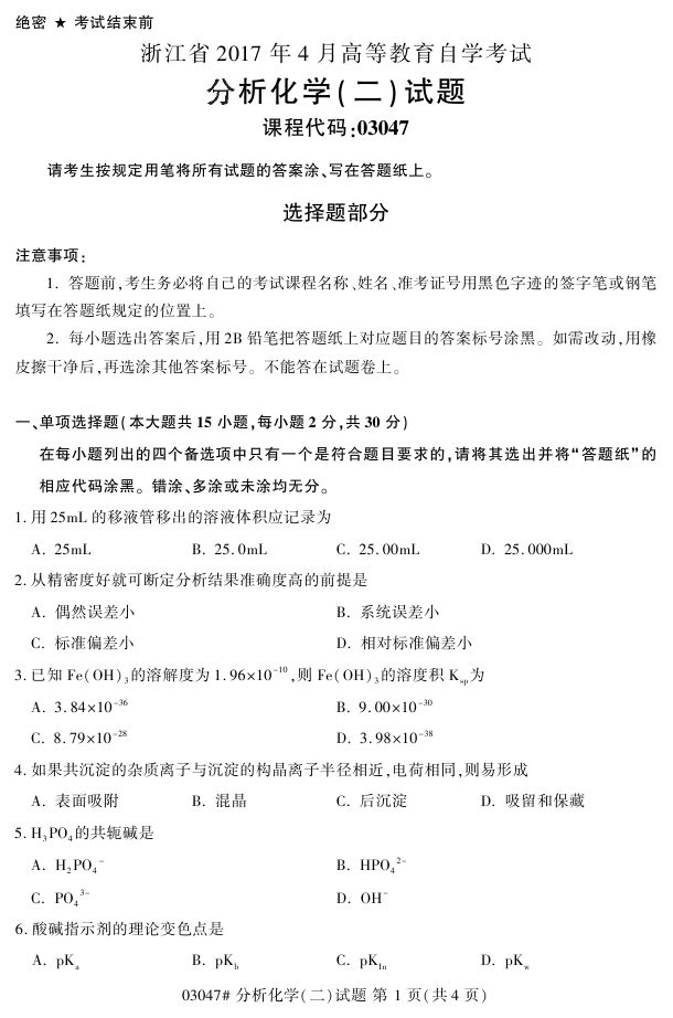 浙江省2017年4月自考03047《分析化学(二)》试题