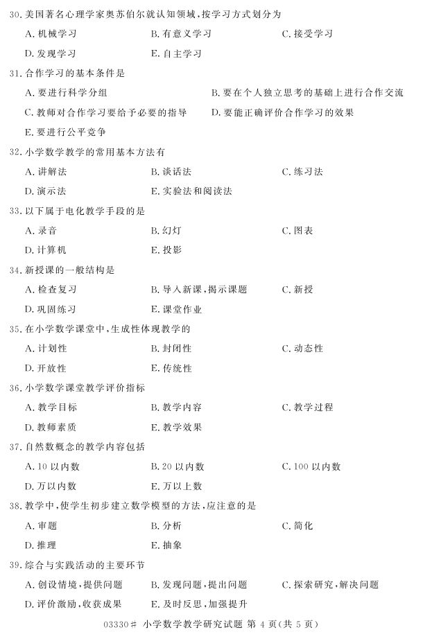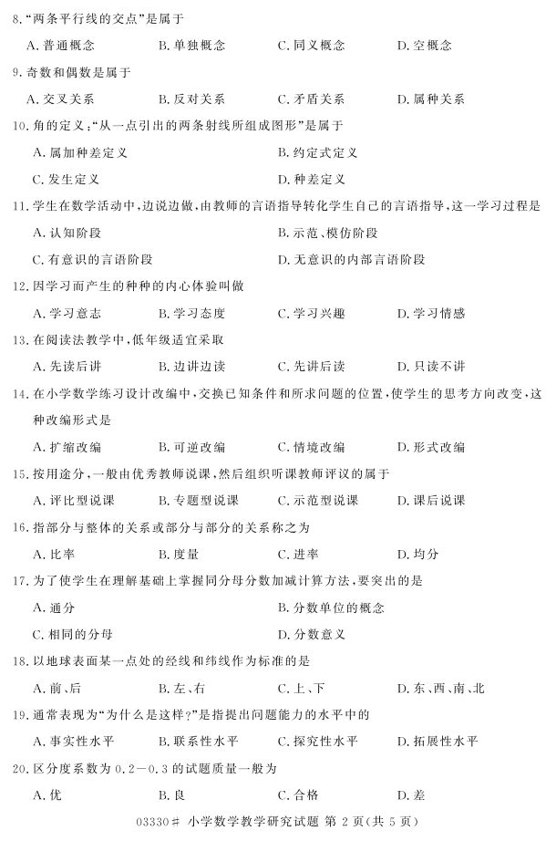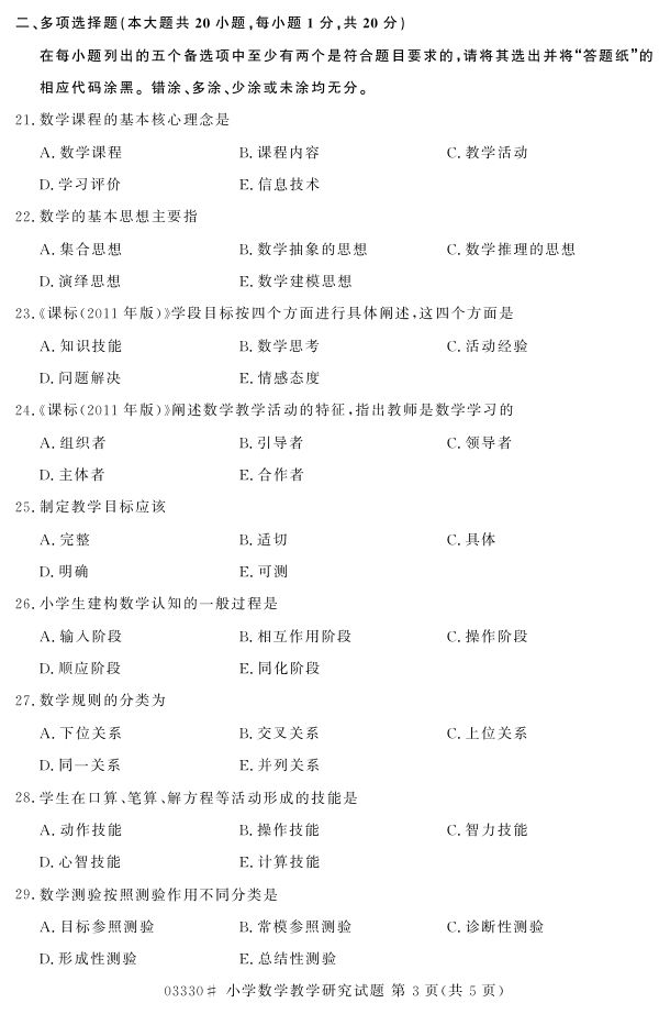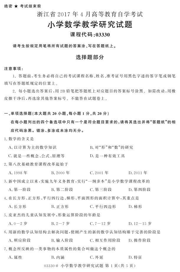 浙江省2017年4月自考03330《小学数学教学研究》试题.pdf