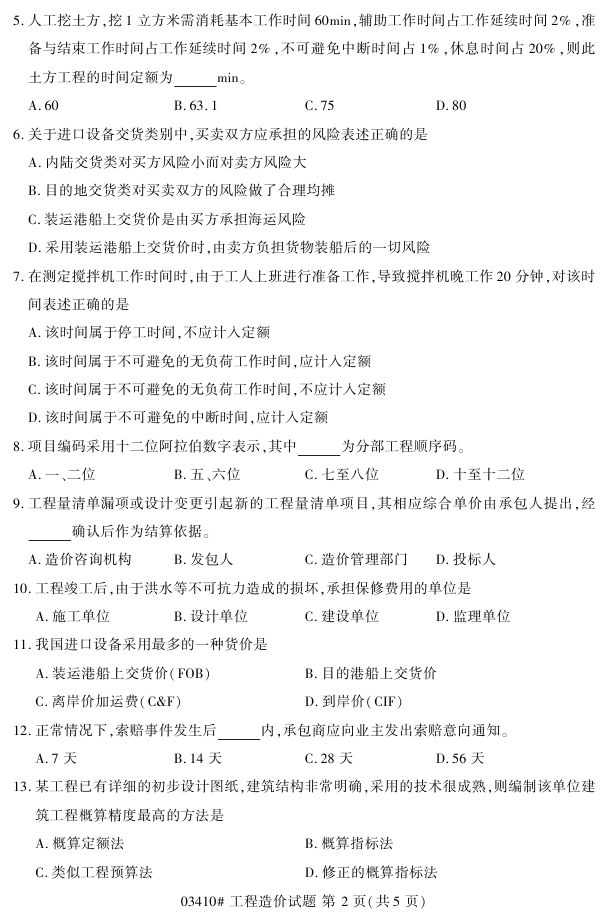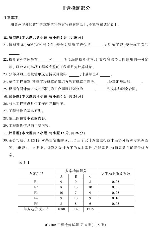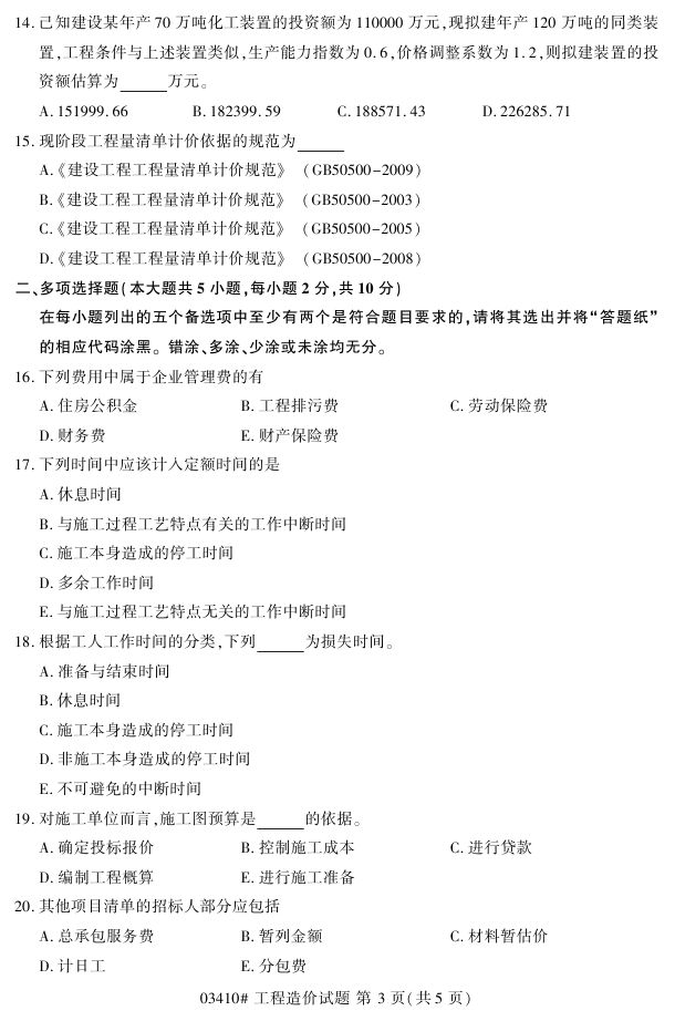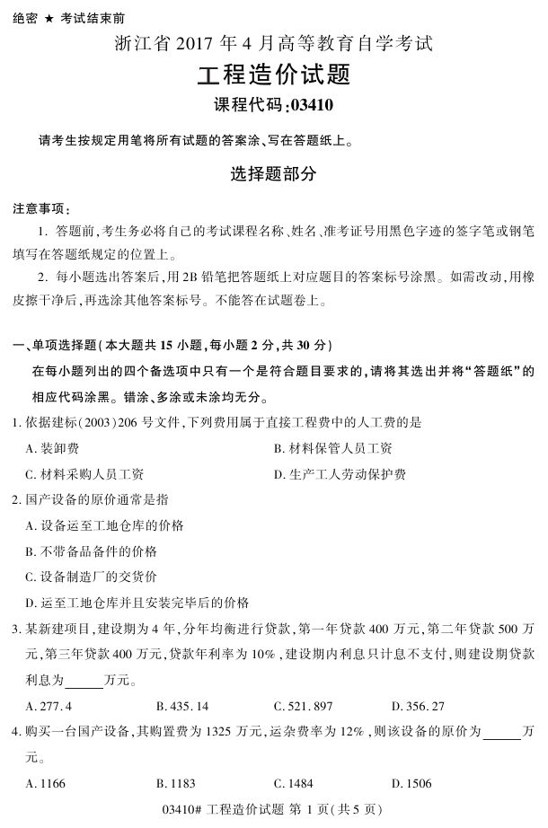 浙江省2017年4月自考03410《工程造价》试题.pdf
