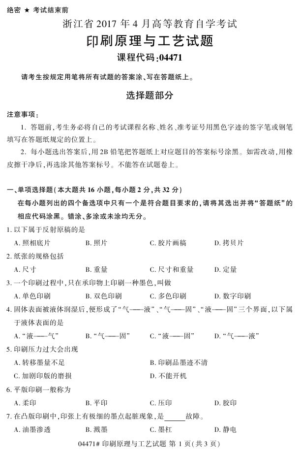 浙江省2017年4月自考04471《印刷原理与工艺》试题.pdf
