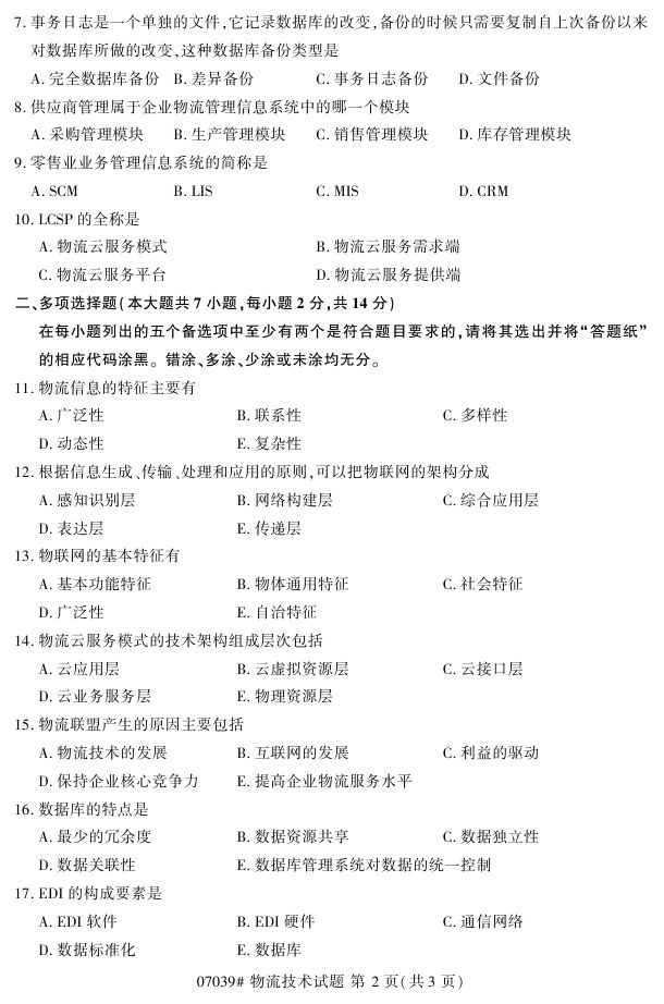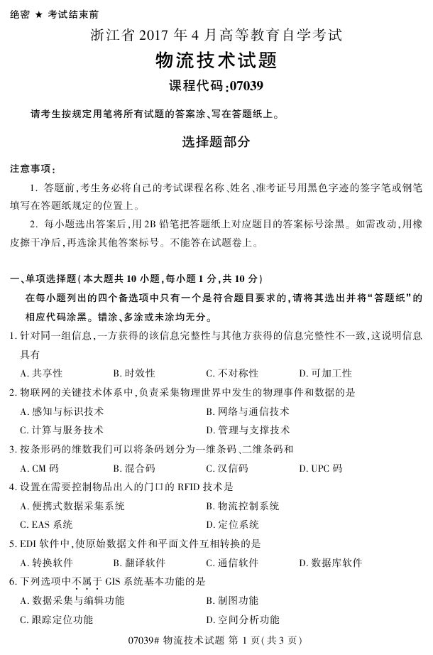 浙江省2017年4月自考07039《物流技术》试题.pdf