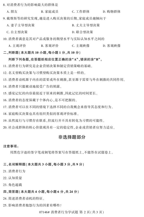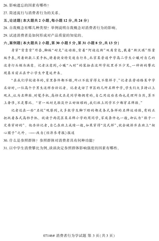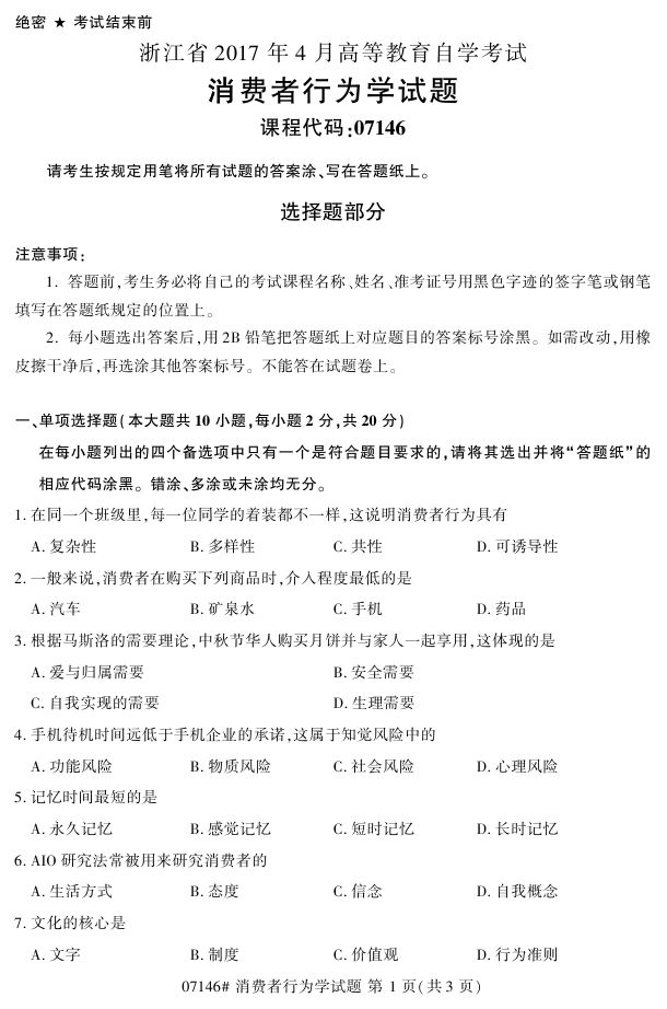 浙江省2017年4月自考07146《消费者行为学》试题.pdf