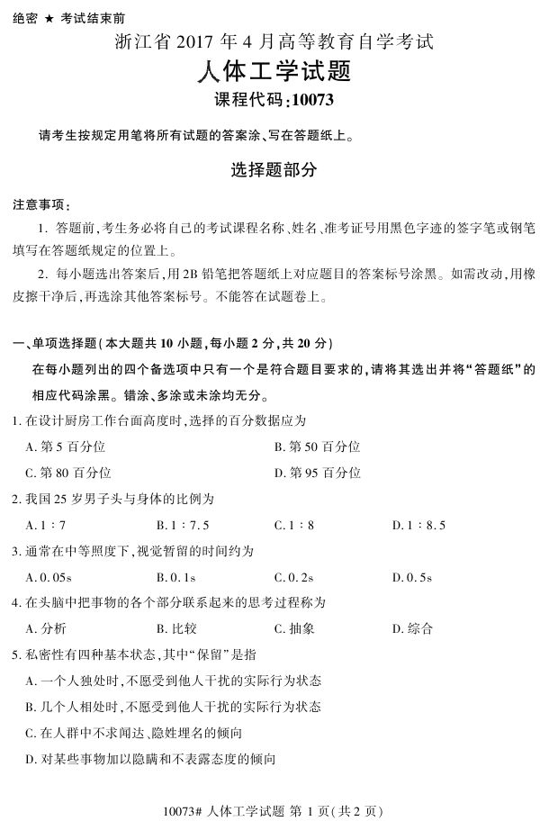浙江省2017年4月自考10073《人体工学》试题.pdf