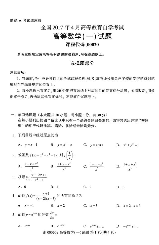 全国2017年4月自考00020《高等数学(一)》试题.pdf