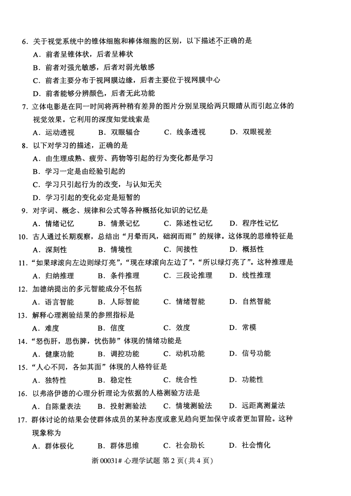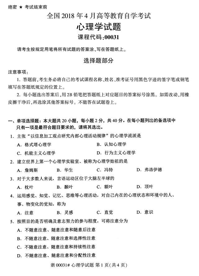 全国2018年4月自考00031心理学试题PDF