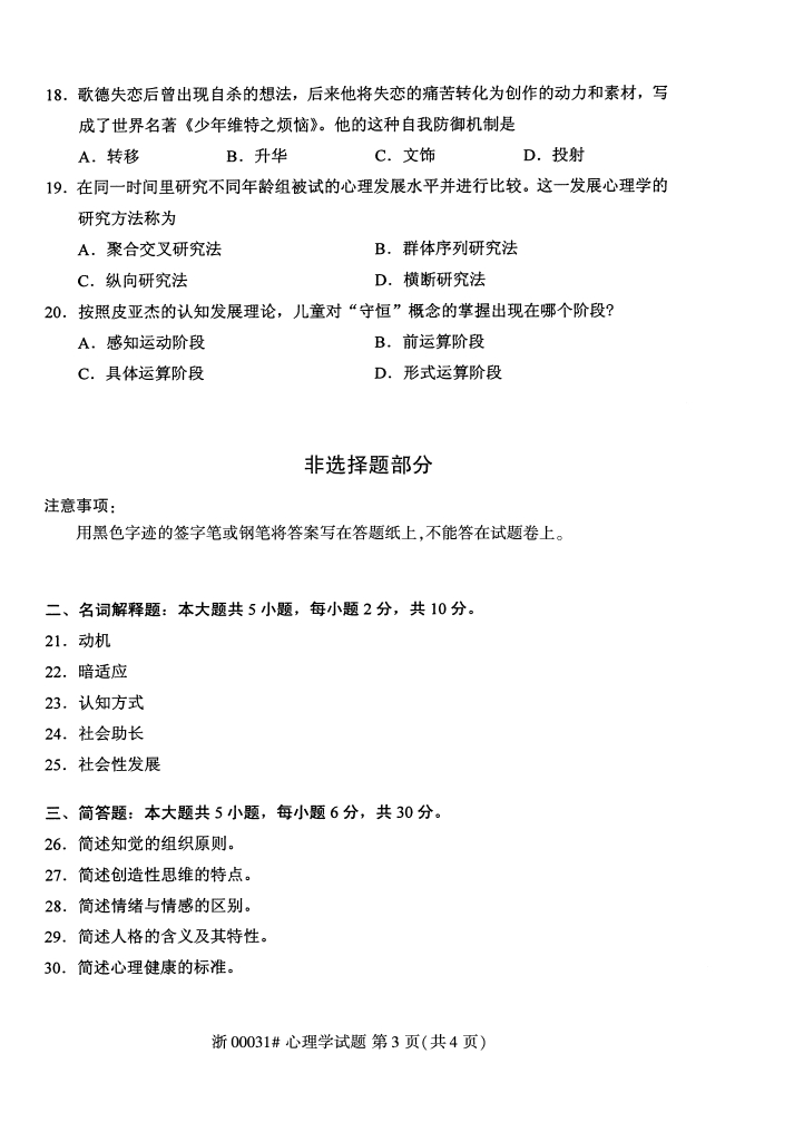 全国2018年4月自考00031心理学试题,由浙江自考网整理。更多自考试题练习,请自考学生关注浙江自考网。