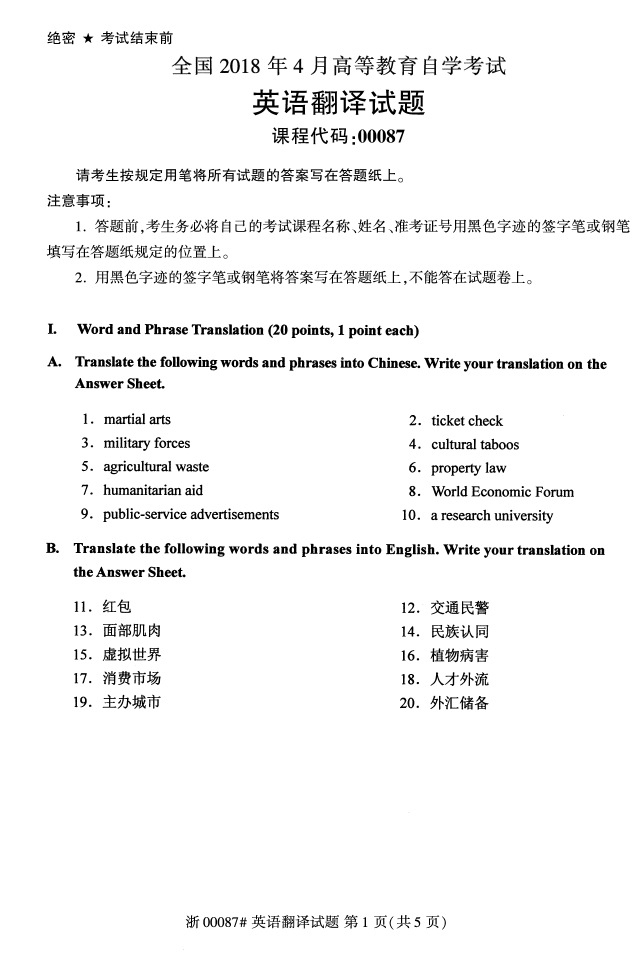 全国2018年4月自考00087英语翻译试题,由浙江自考网整理。更多自考试题练习,请自考学生关注浙江自考网。