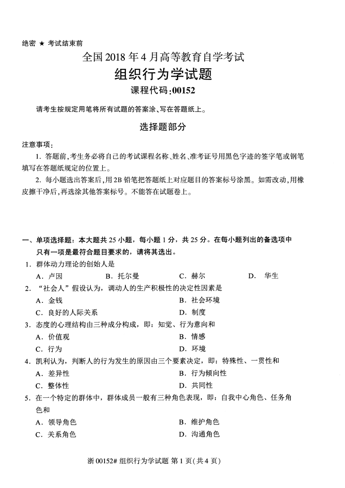 全国2018年4月自考00152组织行为学试题PDF