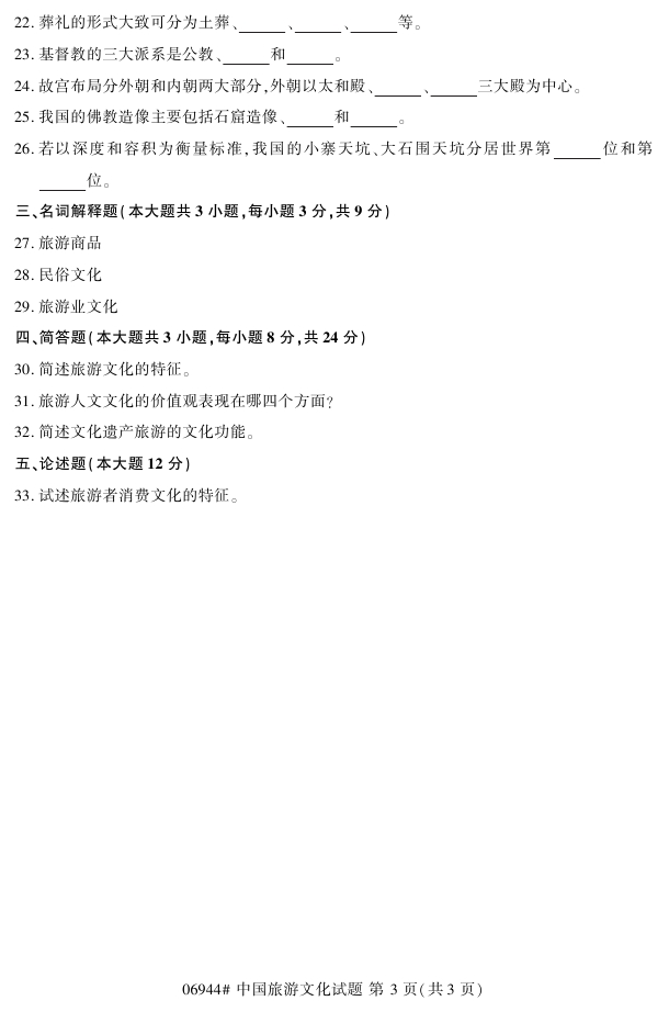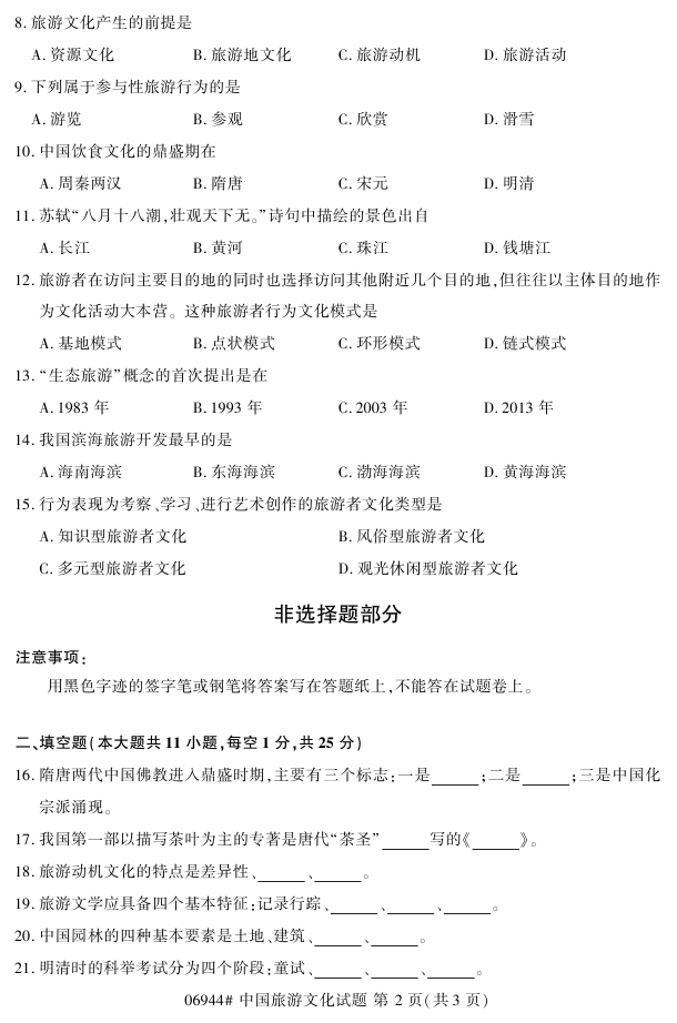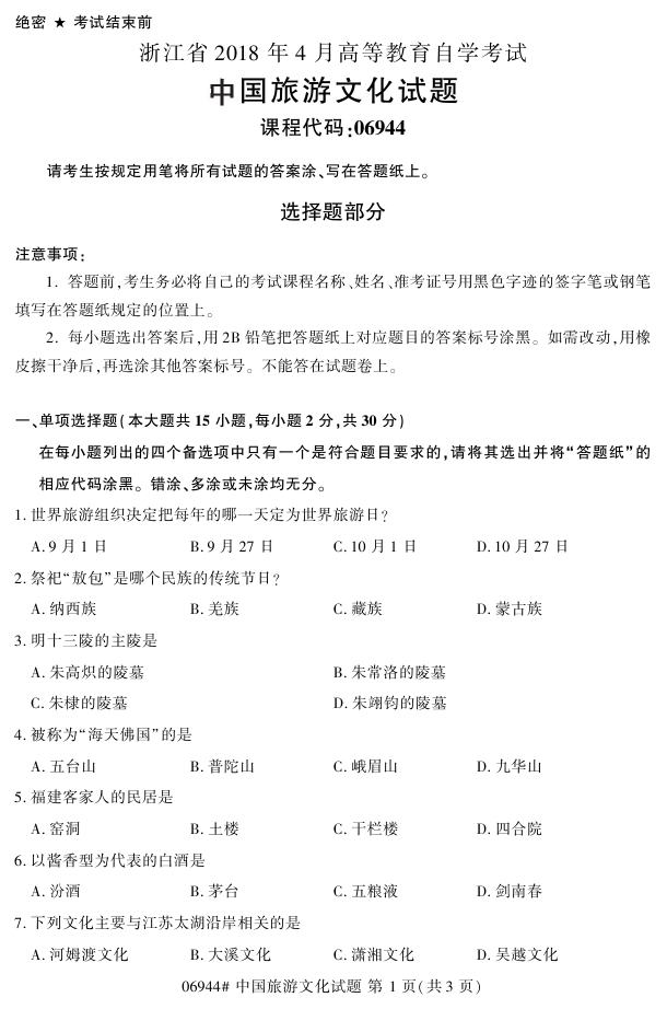 浙江省2018年4月高等教育自考06944中国旅游文化试题PDF