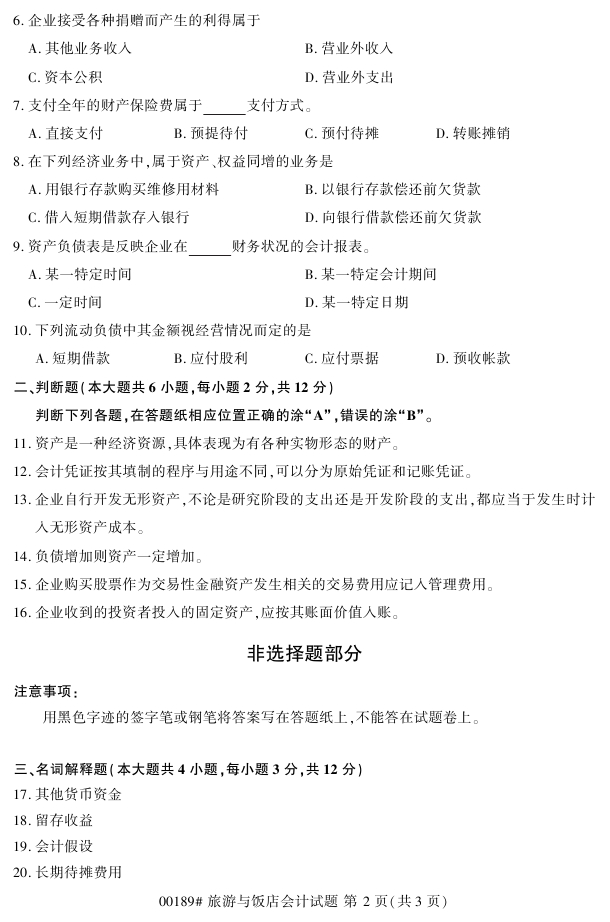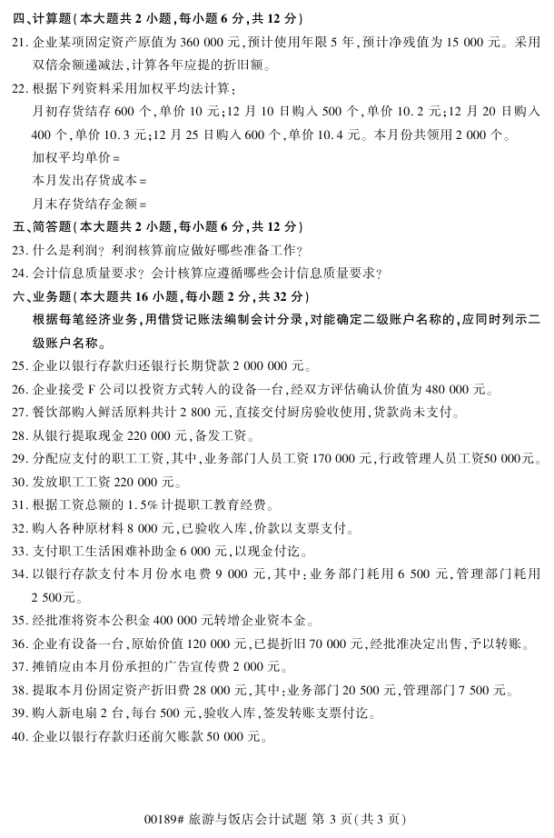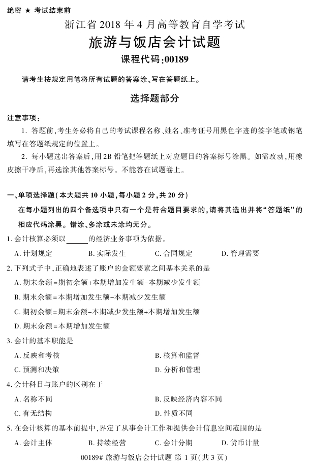 浙江省2018年4月高等教育自考00189旅游与饭店会计试题