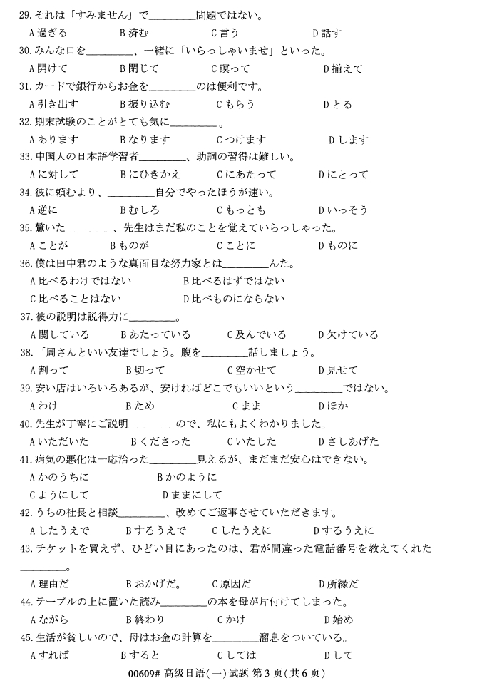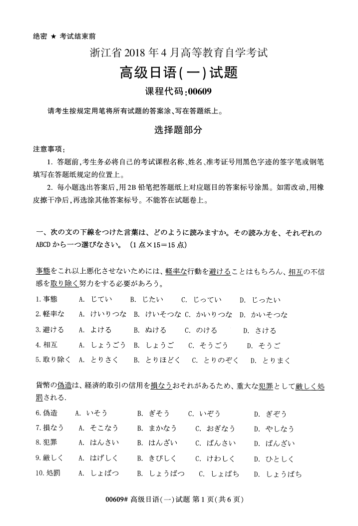 浙江省2018年4月高等教育自考00609高级日语(一)试题PDF