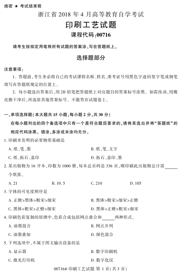 浙江省2018年4月高等教育自考00716印刷试题PDF