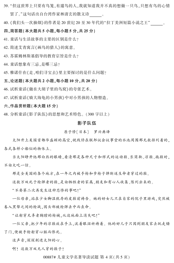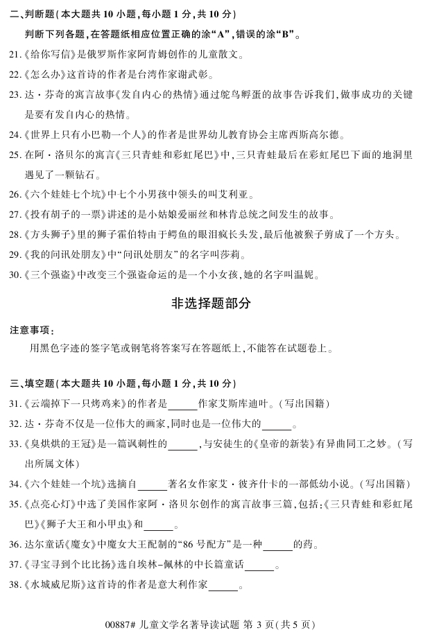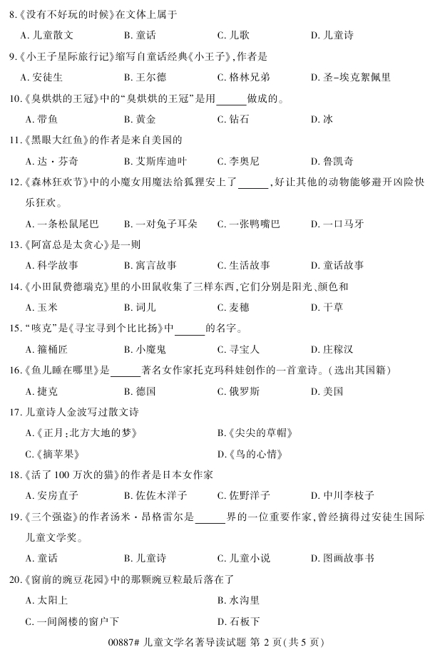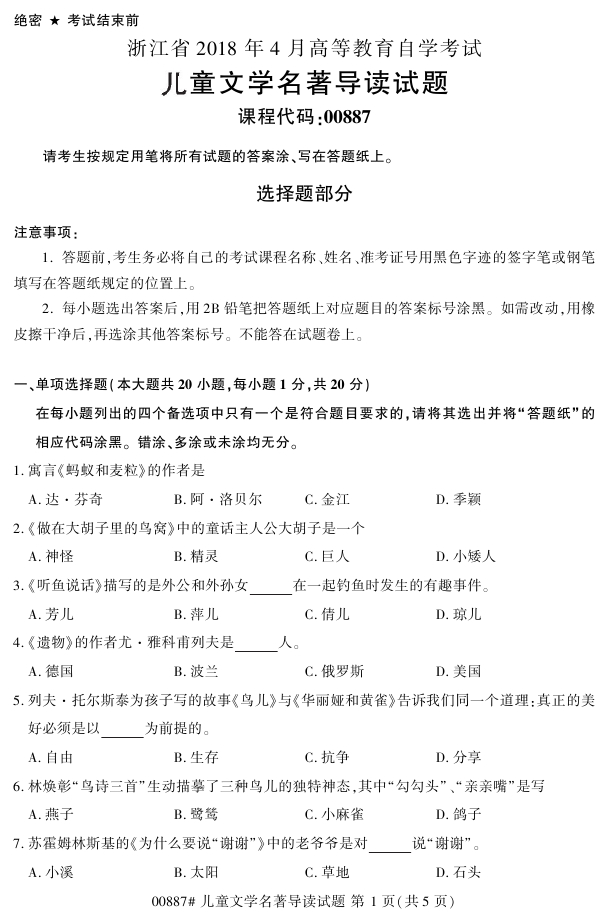 浙江省2018年4月高等教育自考00887儿童文学名著导读试题PDF