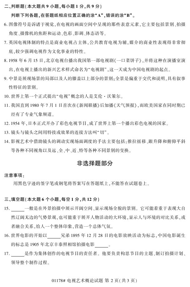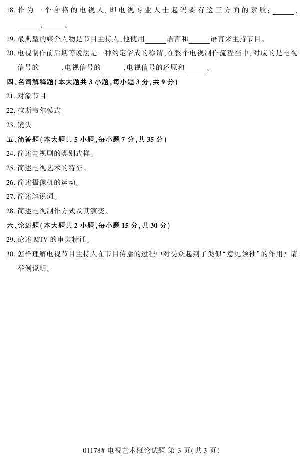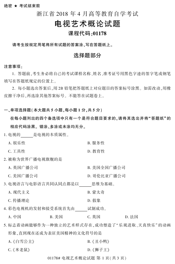 浙江省2018年4月高等教育自考01178电视艺术概论试题PDF