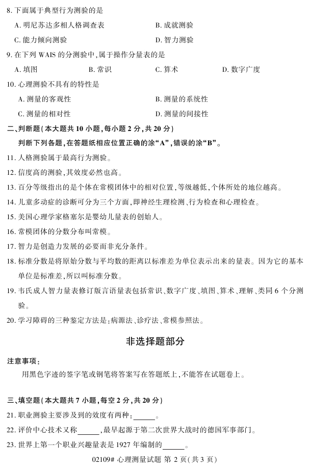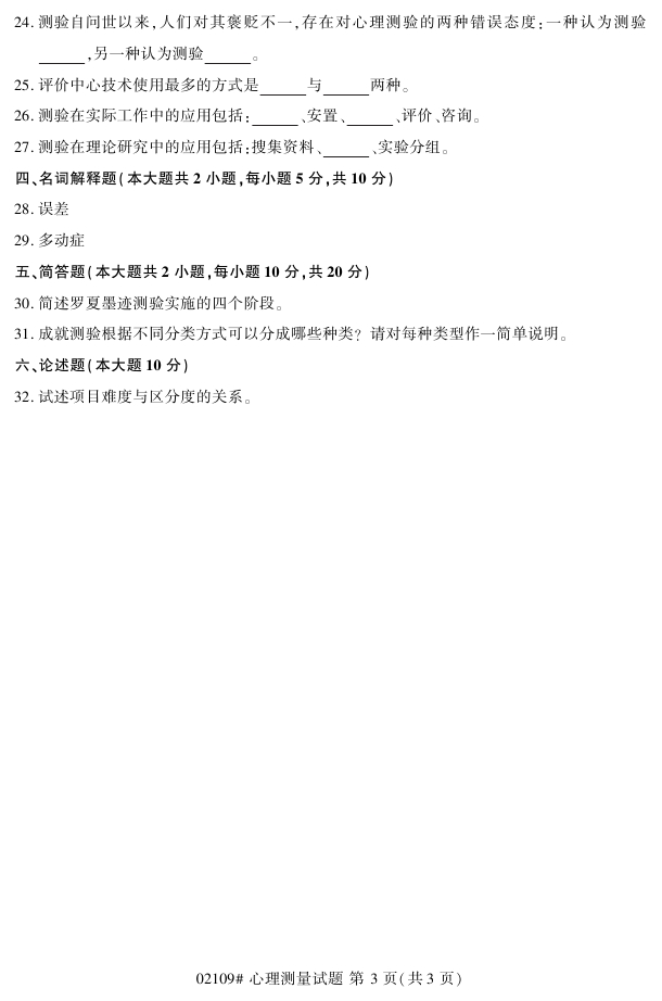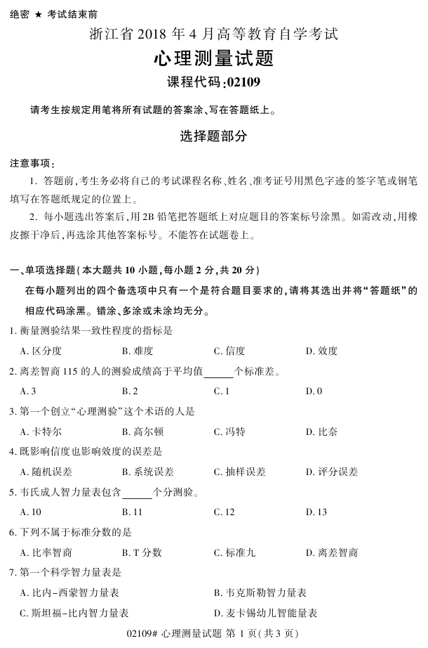 浙江省2018年4月高等教育自考02109心理测量试题PDF