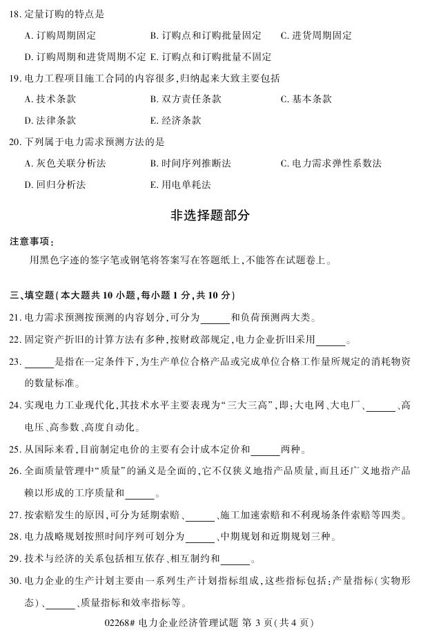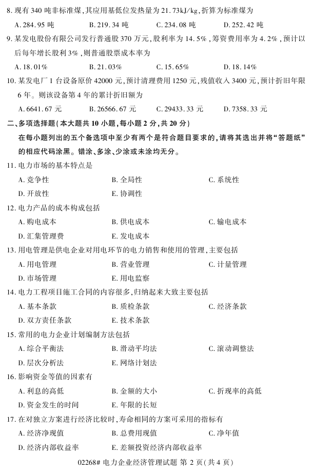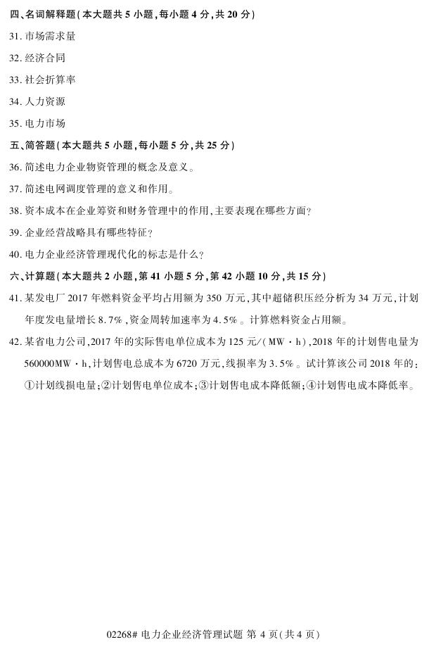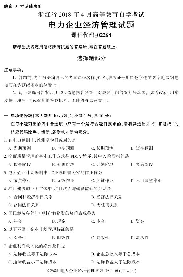 浙江省2018年4月高等教育自考02268电力企业经济管理试题PDF