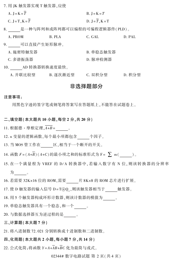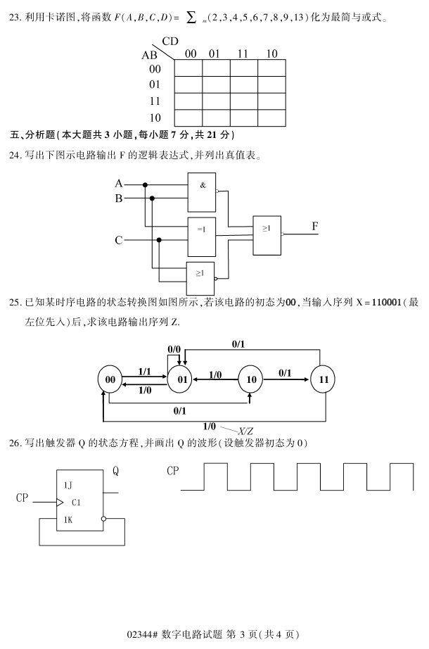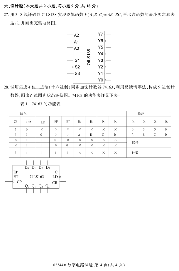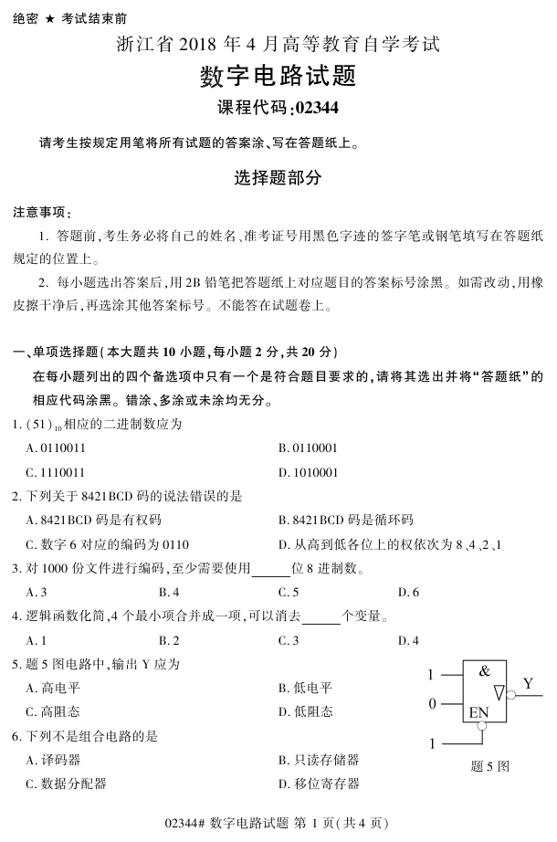 浙江省2018年4月高等教育自考02344数字电路试题PDF