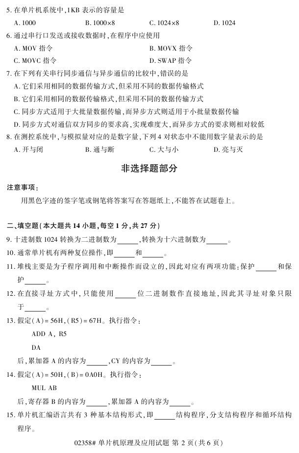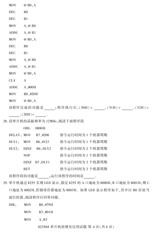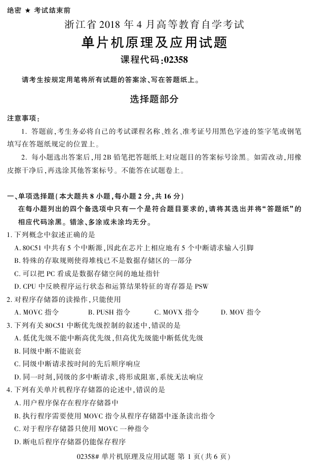 浙江省2018年4月高等教育自考02358单片机原理及应用试题PDF